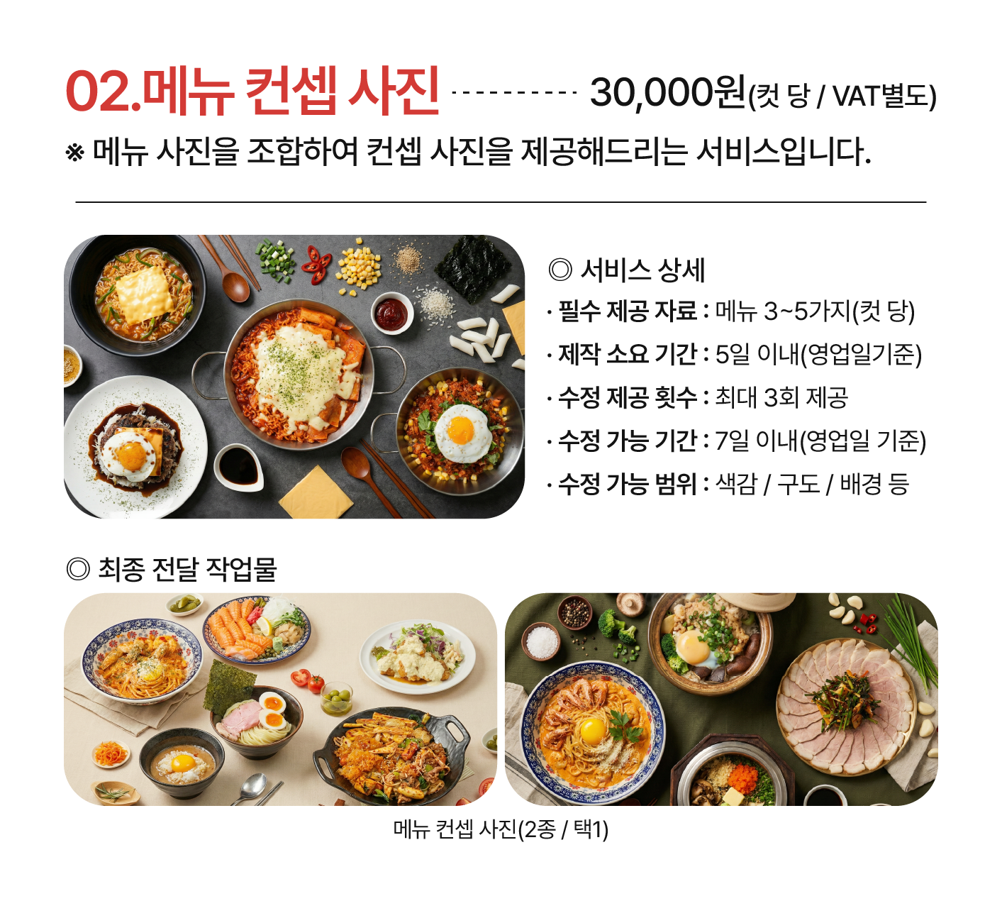 음식의 위치나 구도, 색감과 그리고 배경의 스타일 같은 부분까지도 수정이 가능합니다. 수정은 일주일 기간 내에 요청이 가능하며, 최대 3회 까지 수정 횟수를 제공드리고 있습니다.