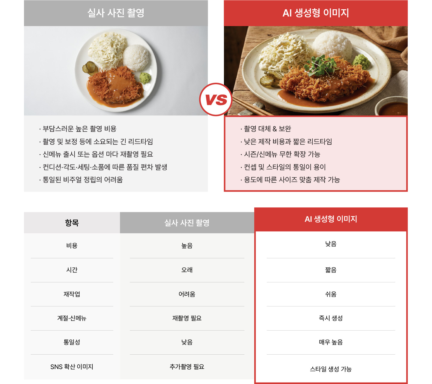 현재 주요 지도 앱 또는 배달 앱은 AI 생성 이미지 자체를 금지하지는 않습니다. 중요한 건 실제 메뉴와 AI로 생성된 이미지 간의 허위·과장 차이가 없어야 한다는 점인데, 저희는 그 가이드 기준에 맞춰 허위·과장이 아닌 보정하는 방식으로 작업을 진행합니다.